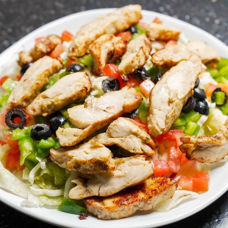 romaine and iceberg lettuce, tender strips of grilled chicken, tomatoes, green peppers, black olives, topped with mozzarella and provolone cheese, and a choice of dressing
