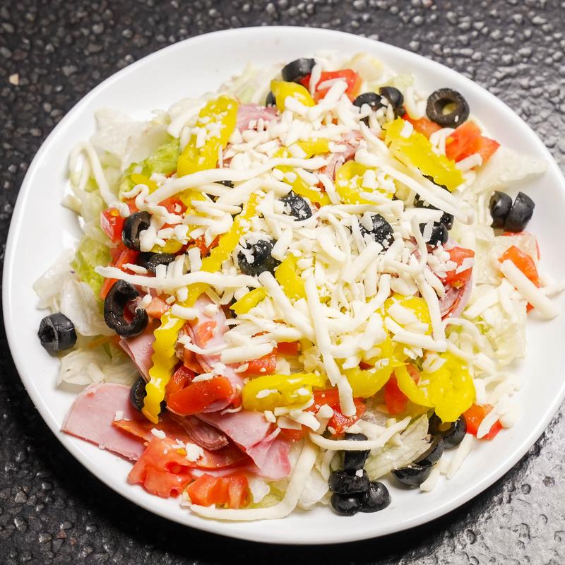 romaine end iceberg lettuce, ham, capicola, salami, tomatoes, black olives, banana peppers, topped with mozzarella and provolone cheese, and a choice of dressing