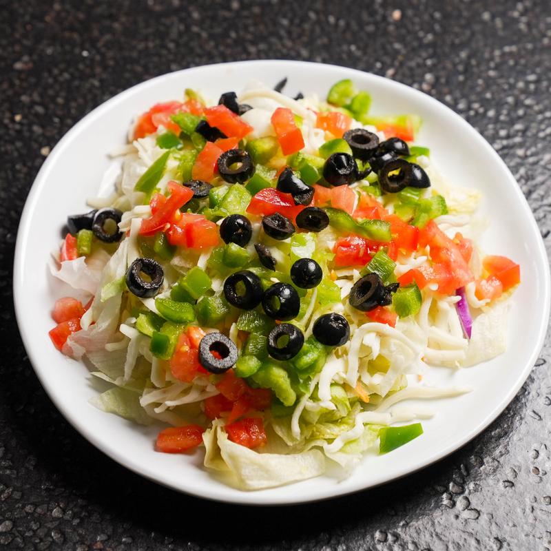 romaine and iceberg lettuce, chili, tomatoes, green peppers, black olives, taco chips, topped with cheddar, mozzarella, and provolone cheese, and a choice of dressing (recommended with ranch dressing)