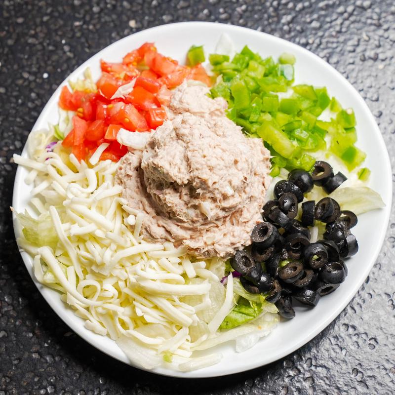 romaine and iceberg lettuce, a scoop of fresh tuna, tomatoes, and green peppers. black olives, topped with mozzarella and provolone cheese, and a choice of dressing